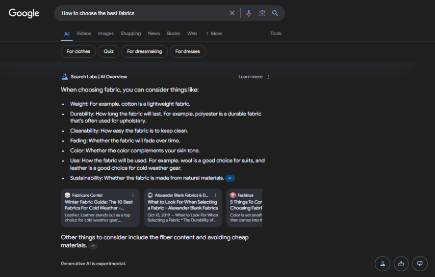 For example, if you google “how to choose the best fabrics”, generates this AI Overview generates this: